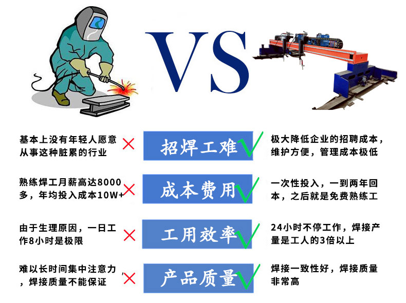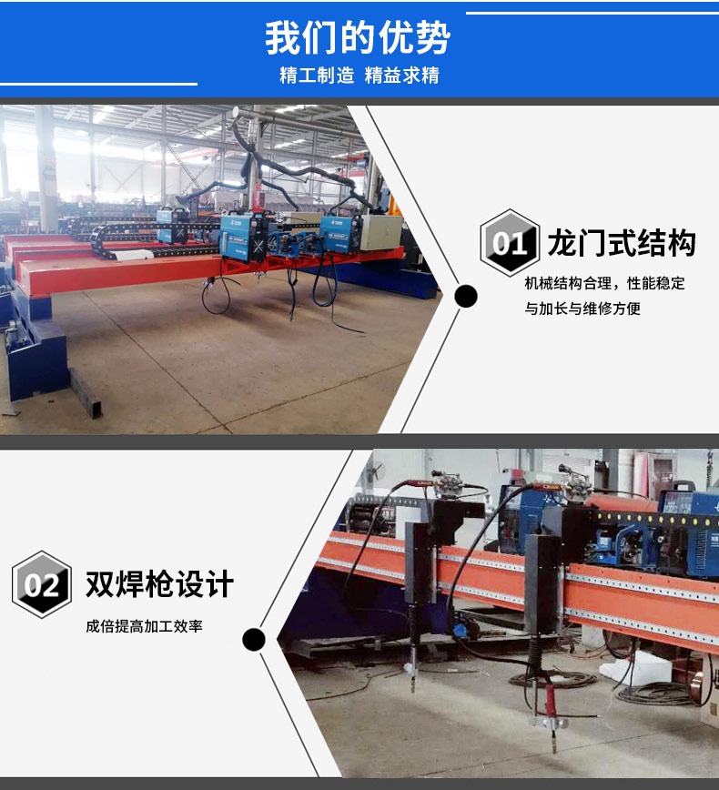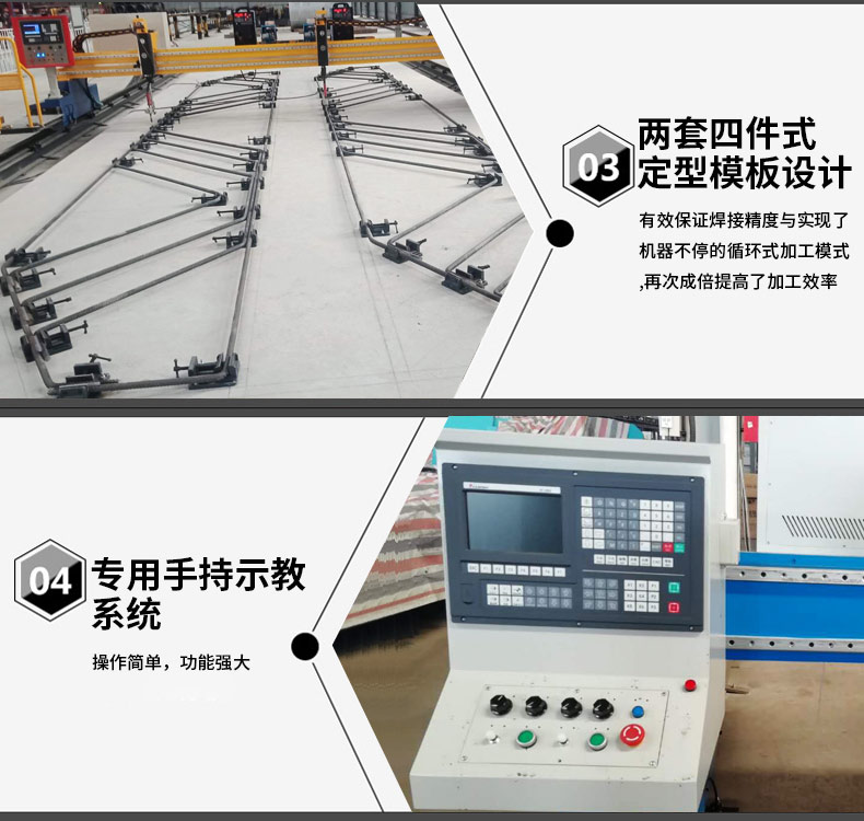 獨(dú)創(chuàng)的龍門式結(jié)構(gòu);機(jī)械結(jié)構(gòu)合理,性能穩(wěn)定與加長與維修方便;雙焊設(shè)計(jì);成倍提高加工效率;兩套四件式定型模板設(shè)計(jì);有效保證焊接精度與實(shí)現(xiàn)了機(jī)器不停的循環(huán)式加工模式;再次成倍提高了加工效率。公司開發(fā)的焊接機(jī)器人專用手持示教系統(tǒng):操作簡單,功能強(qiáng)大。