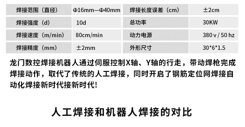 隨著我國經(jīng)濟(jì)的迅速發(fā)展,生產(chǎn)周期在不斷地縮短,焊接自動(dòng)化、焊接質(zhì)量要求不斷地提高,使得數(shù)控鋼筋加工裝備替代傳統(tǒng)手工加工及半自動(dòng)機(jī)械加工鋼筋成為必然趨勢。到目前為止,國內(nèi)蓋梁骨架片焊接工作90%以上都是由人工焊接完成。存在效率低下,質(zhì)量不可控,工人勞動(dòng)強(qiáng)度高與身體傷害嚴(yán)重。公司在這樣的市場環(huán)境下研發(fā)出國內(nèi)一臺龍門式蓋梁骨架片焊接機(jī)器人,同時(shí)開啟了蓋梁鋼筋骨架片自動(dòng)化焊接新時(shí)代!
